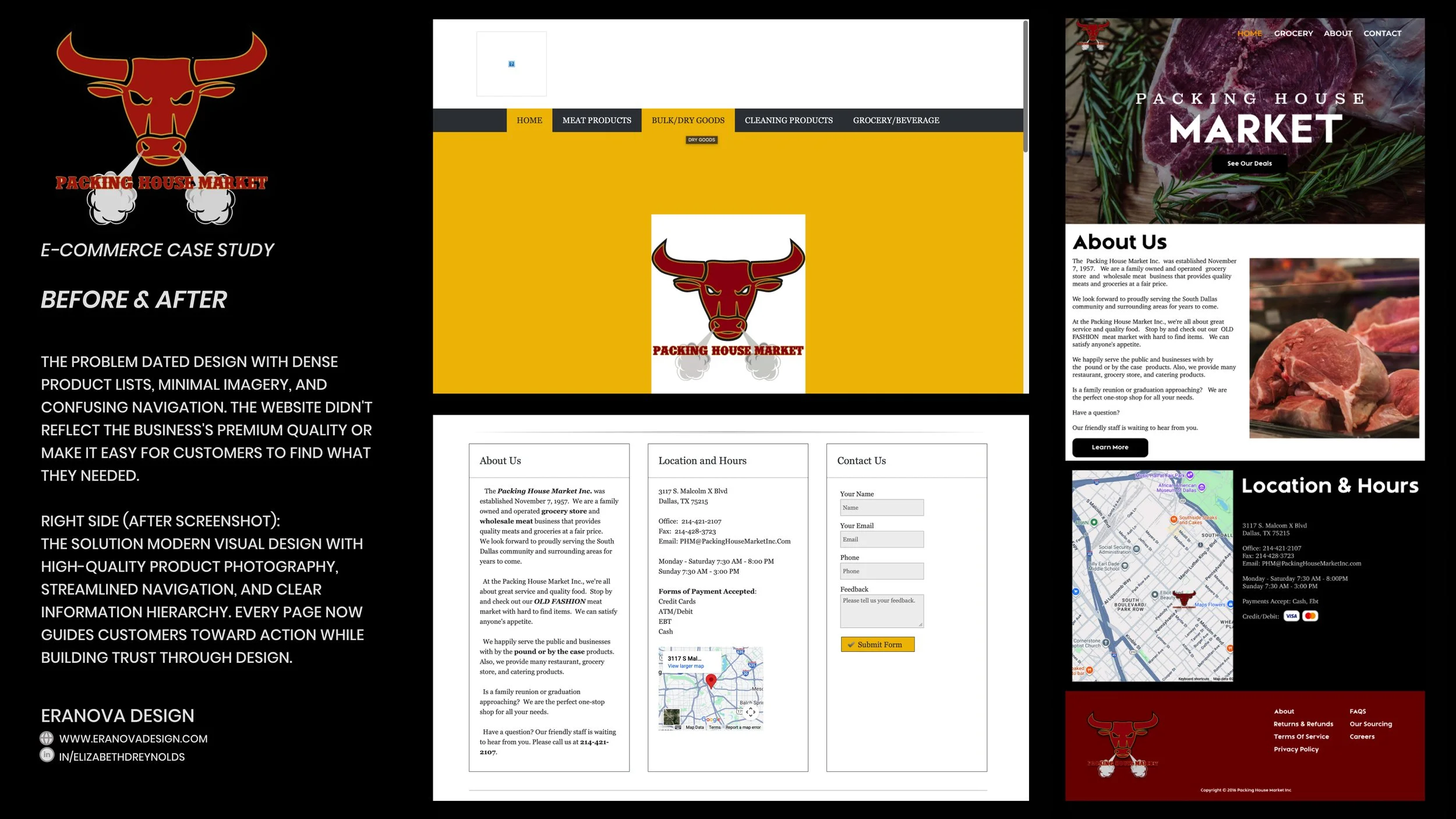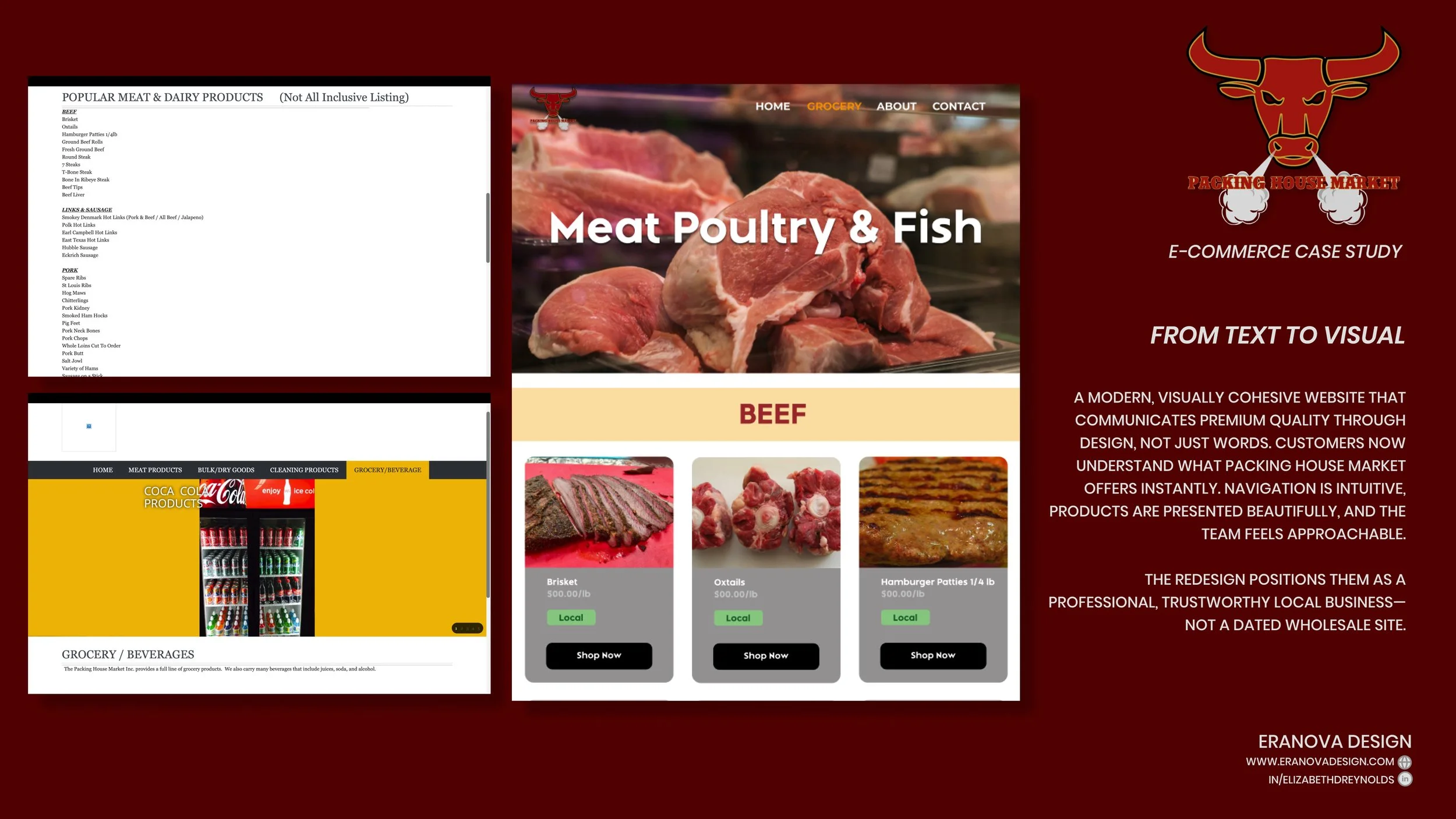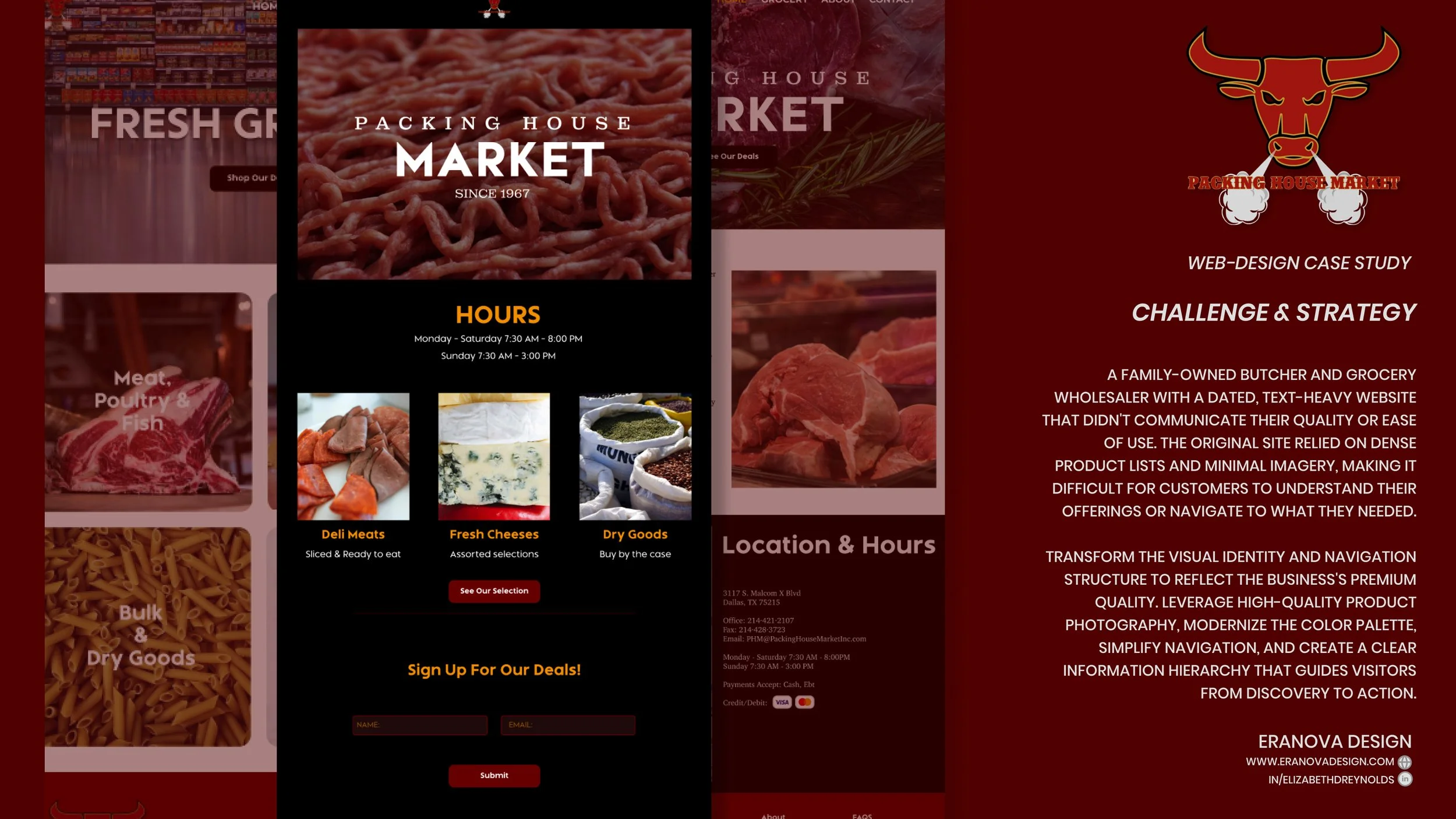 Packing House Market is a family-owned butcher and wholesale grocery business serving South Dallas since 1957. Their website failed to reflect their quality or accessibility. Dense product lists, minimal imagery, and confusing navigation meant customers couldn't easily find what they needed or understand the breadth of their offerings. The outdated design also didn't convey the professionalism and premium quality that defines the business.