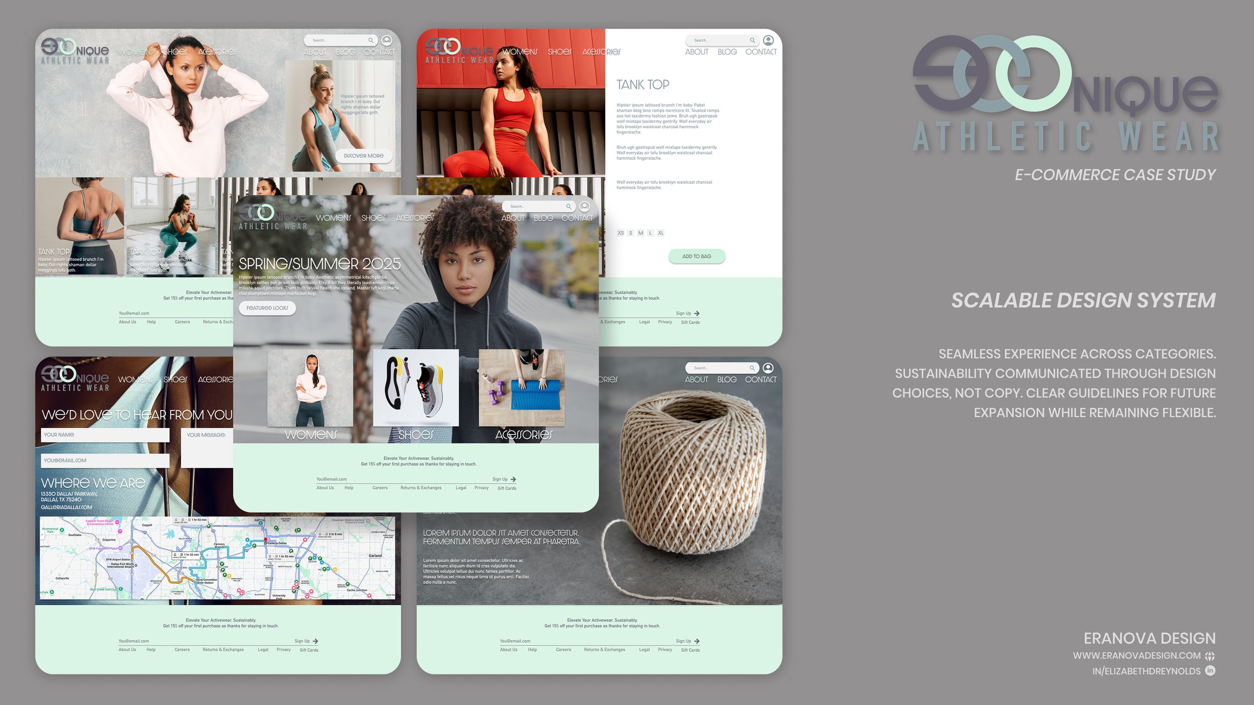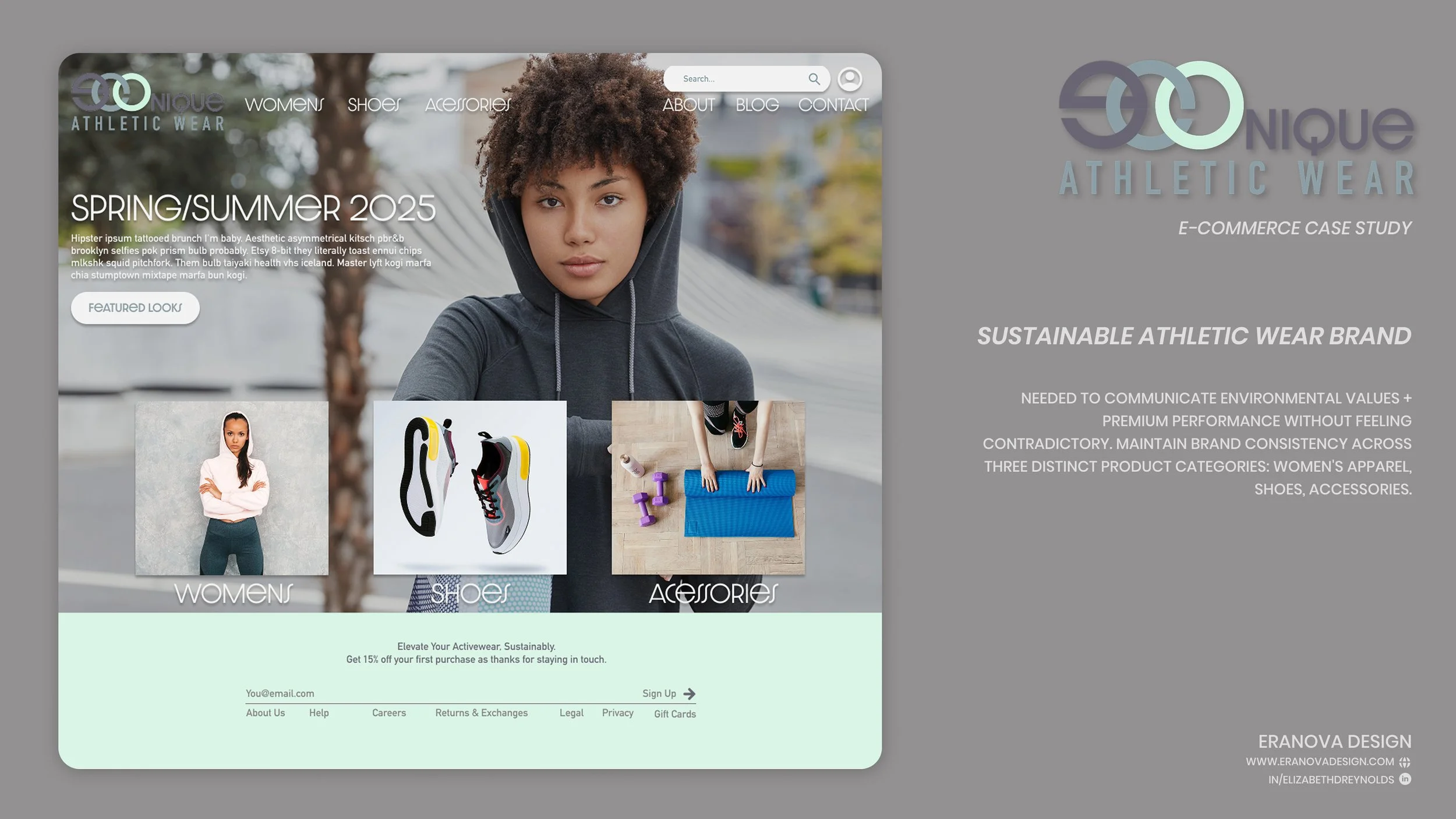 Econique is a sustainable athletic wear brand built entirely from hemp and renewable materials. The challenge was to design a cohesive e-commerce experience that communicates environmental values while maintaining a premium aesthetic across three distinct product categories, women's apparel, shoes, and accessories, without losing visual or navigational consistency.