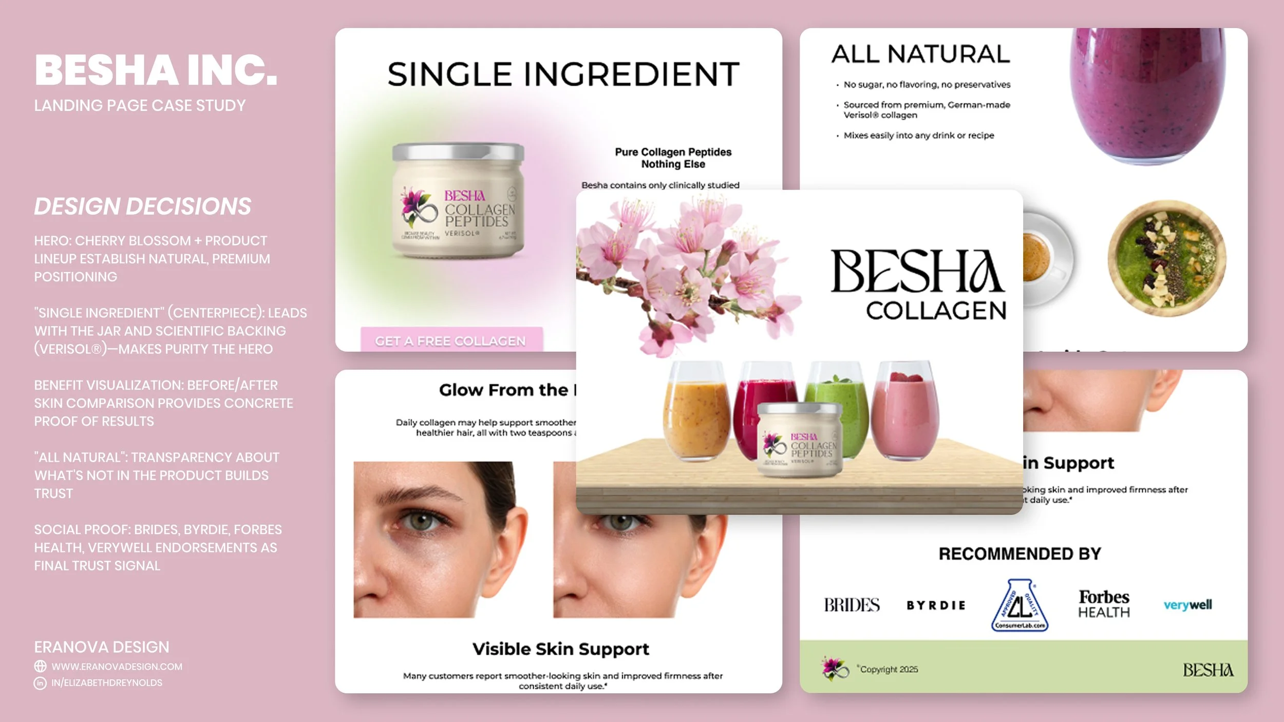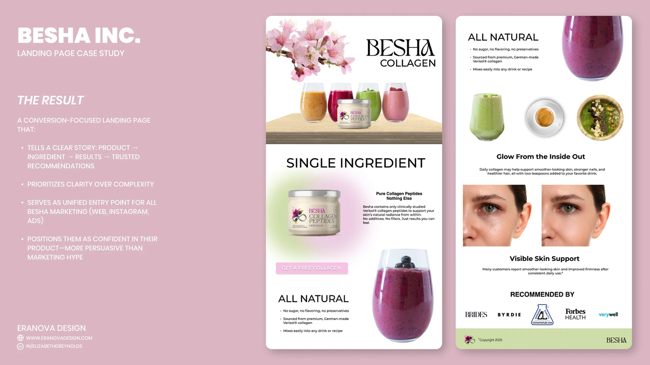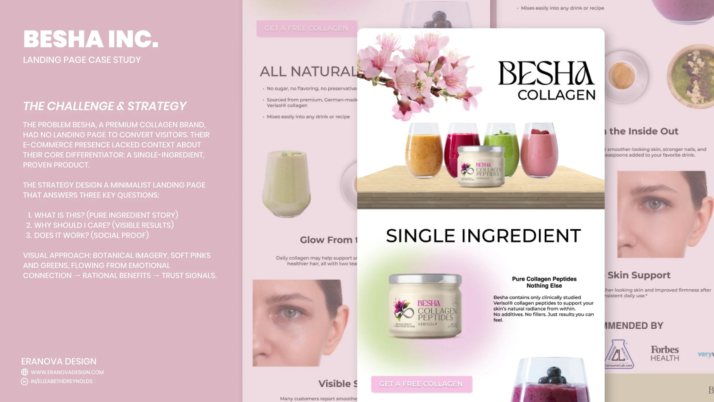This project taught me that in wellness e-commerce, authenticity beats hype every time. Customers in this space are skeptical of over-claiming and marketing language, they want proof and transparency. By designing a page that feels confident rather than salesy, Besha positioned themselves as different from competitors. It also deepened my understanding of how to integrate a single web project across an entire marketing ecosystem, not just build a standalone page.